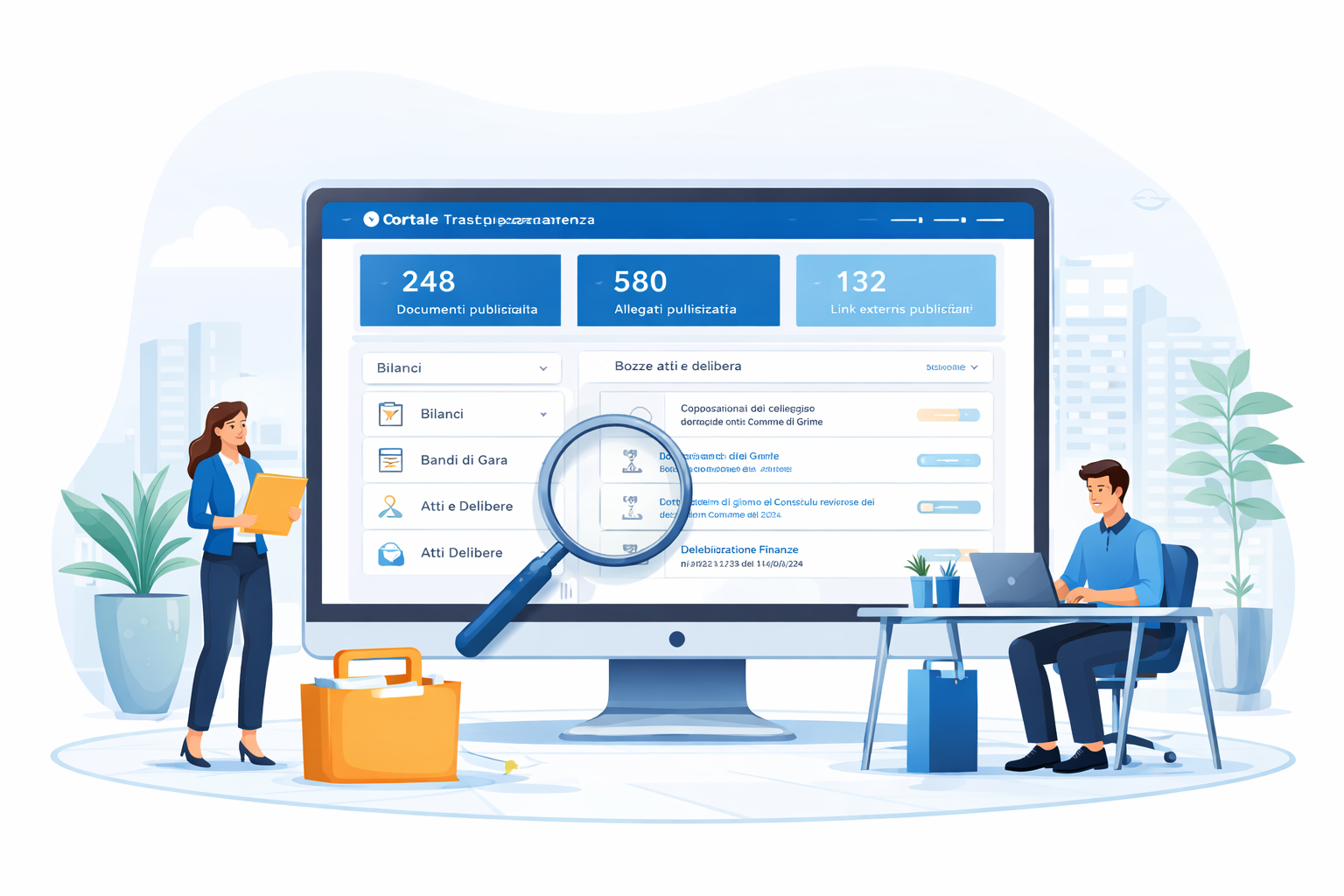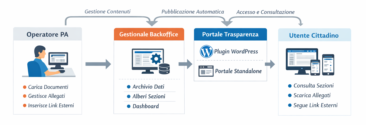 Fornire una piattaforma per la gestione e pubblicazione dei contenuti relativi alla Trasparenza della Pubblica Amministrazione, organizzati per sezioni e sottosezioni, con documenti, allegati e collegamenti esterni, consultabili da desktop e mobile.
